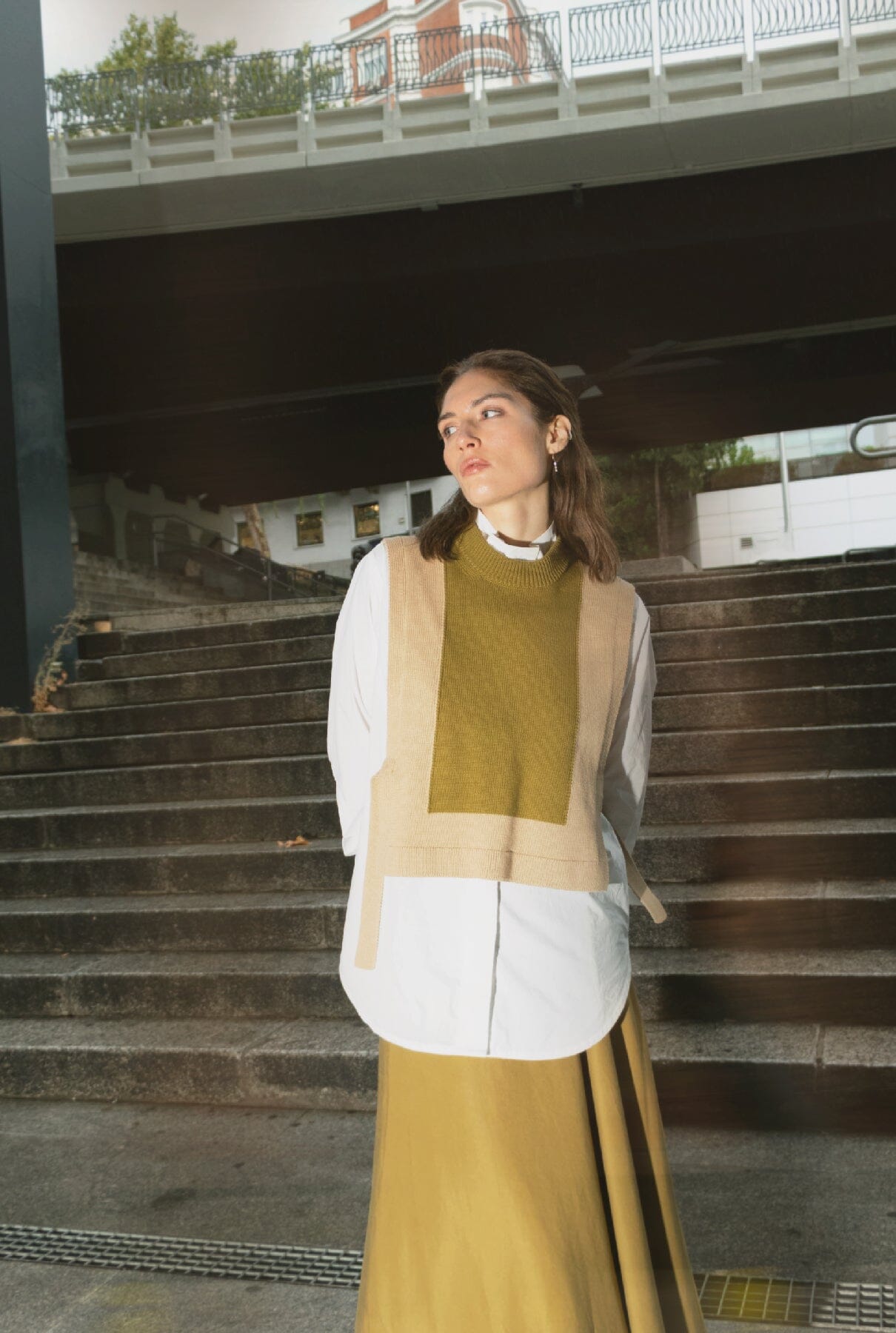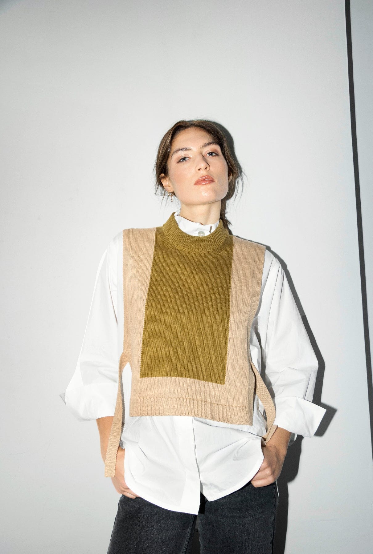Chaleco de punto con cuello alto. Tiene dos tiras a los lados para atar o dejar sueltas.