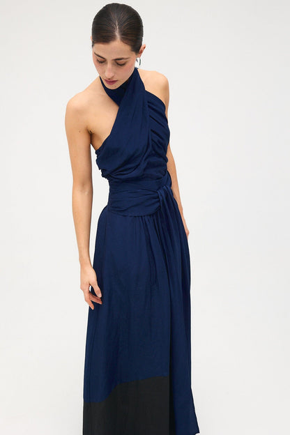 Top drapeado con escote halter. Cruzado por delante y abotonado por detrás.