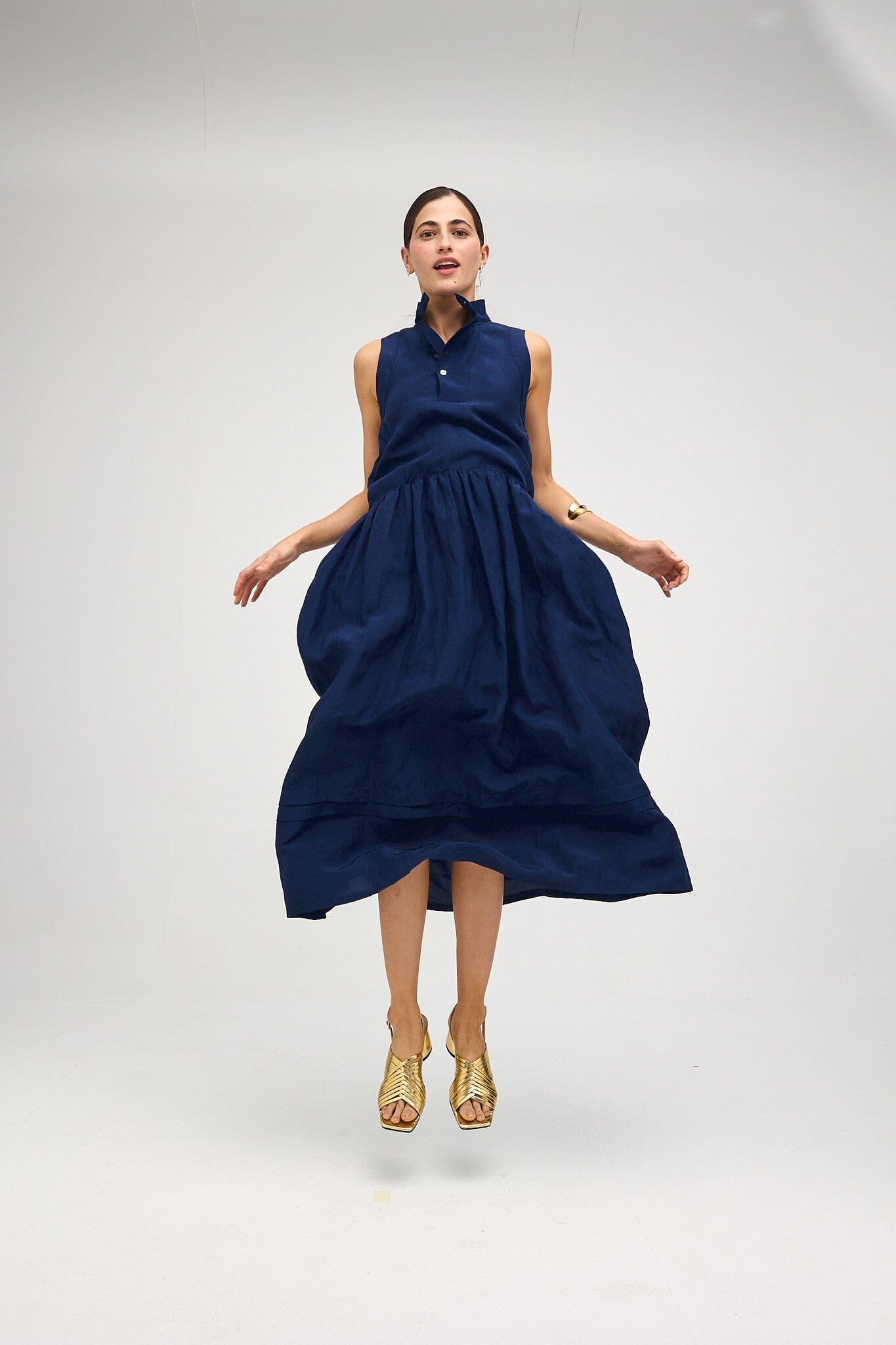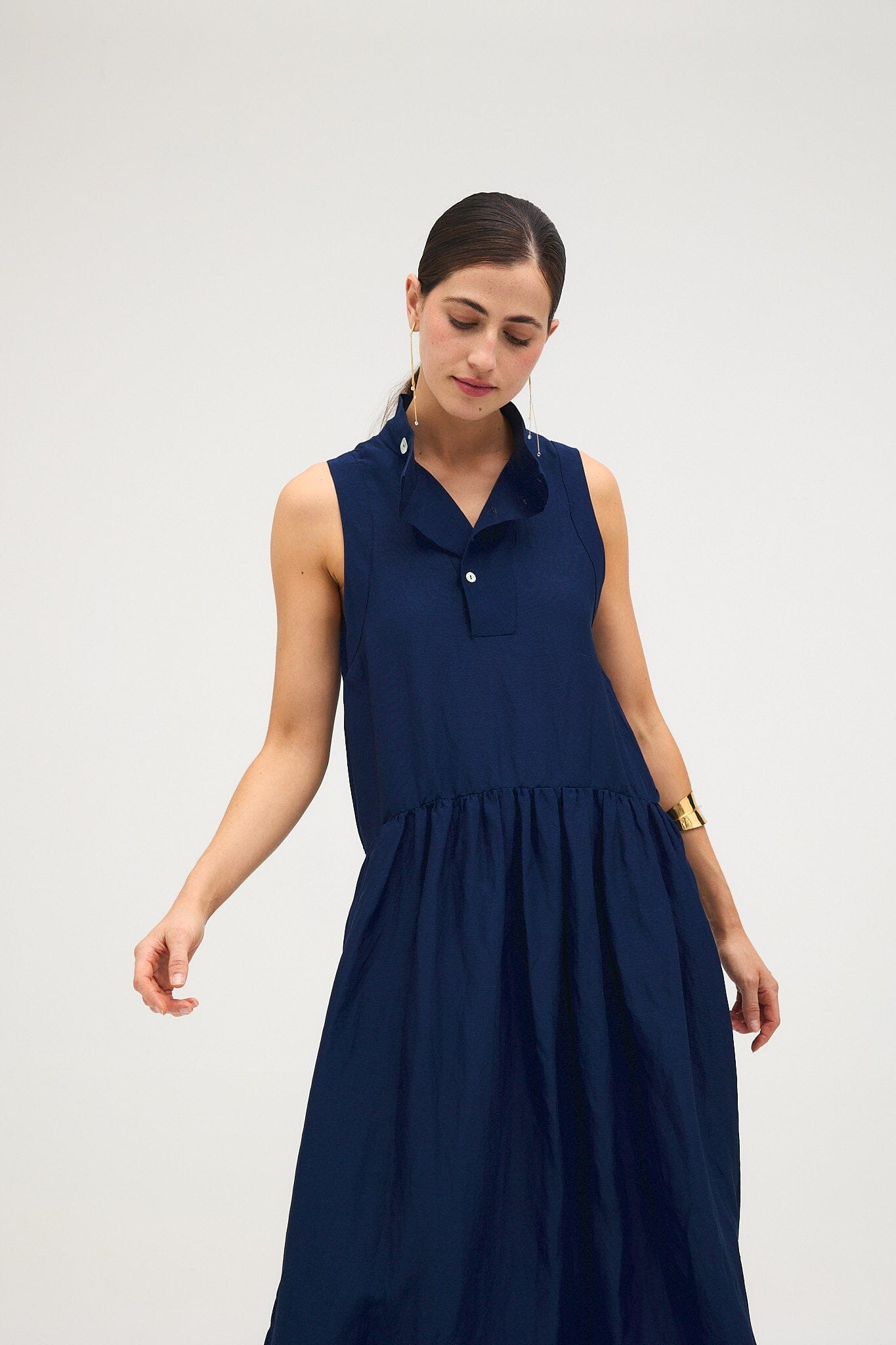 Vestido amplio sin mangas con corte a la cadera. Presenta una tapeta asimétrica y un cuello alto que resulta muy favorecedor tanto abierto como cerrado. La falda, con mucho volumen gracias al frunce y al evasé, tiene dos jaretones y bolsillos.
