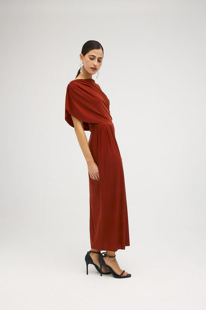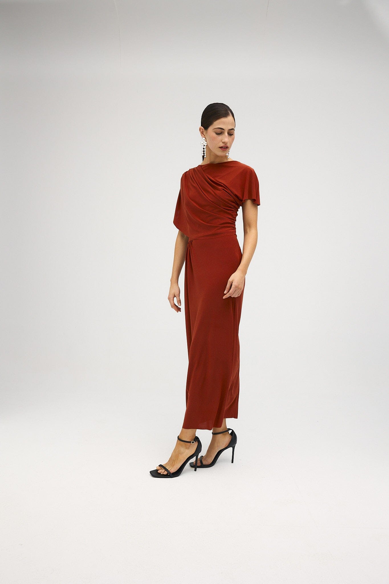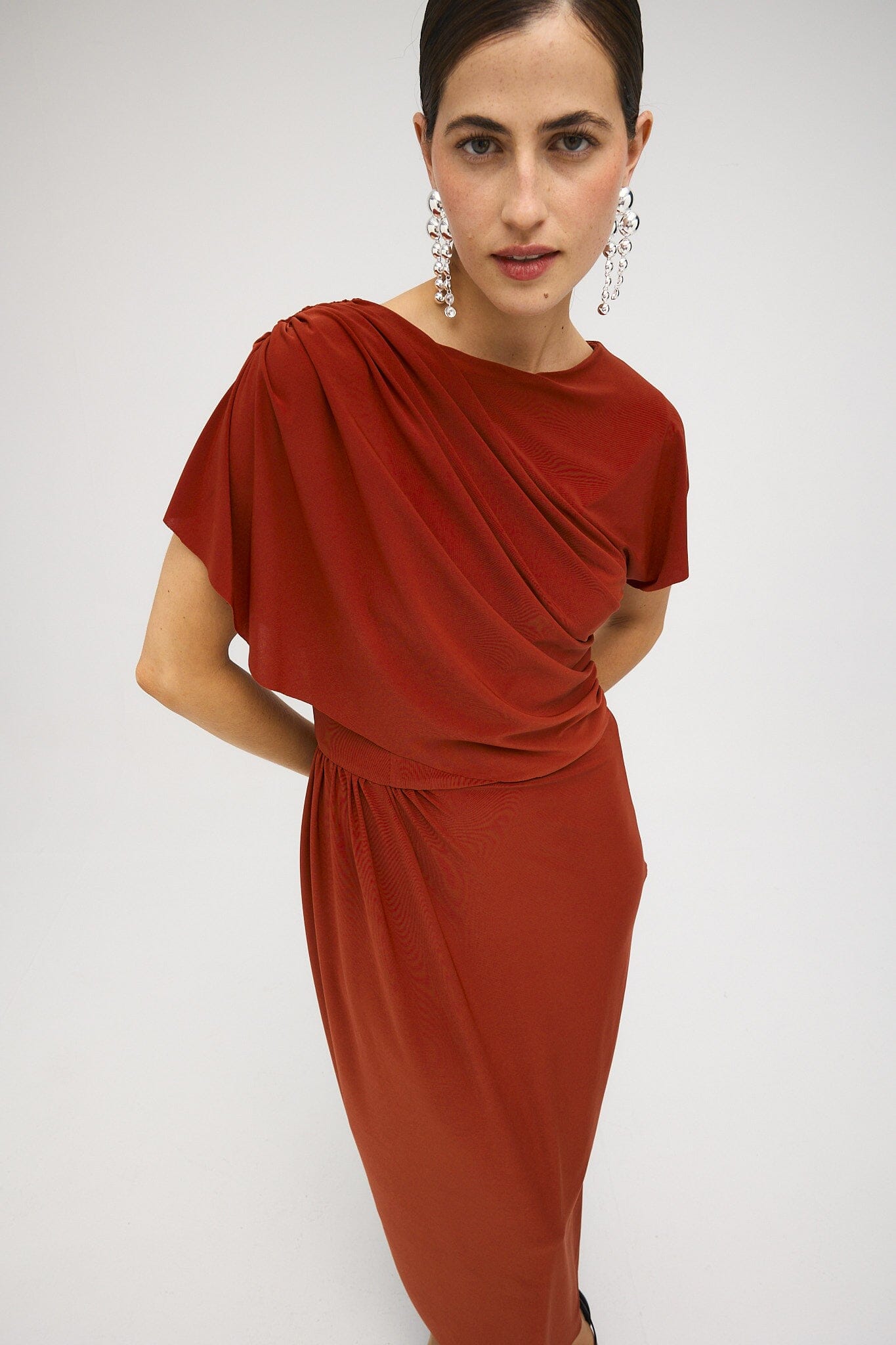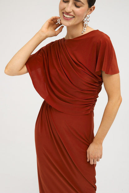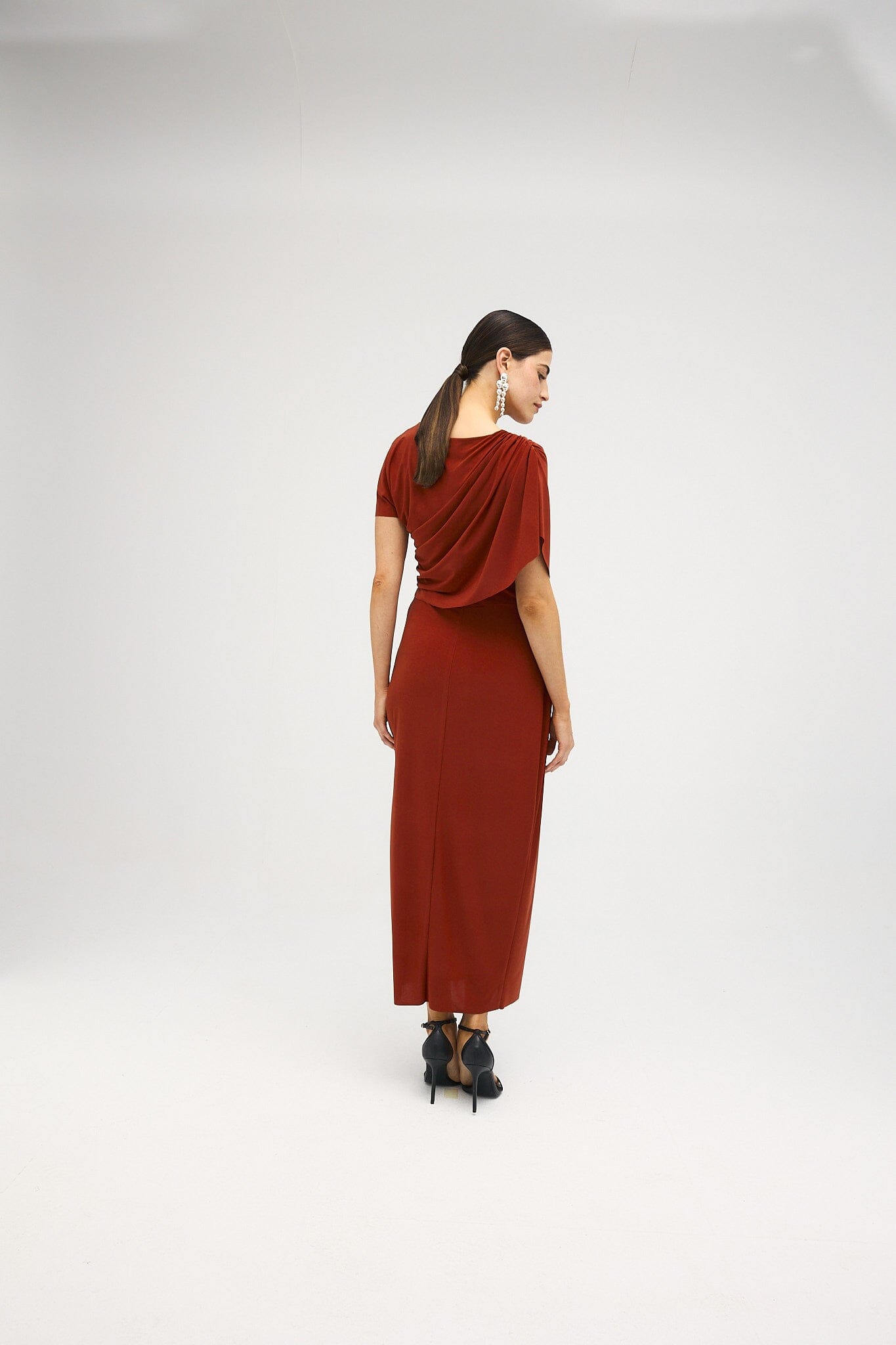 Vestido drapeado de punto en color teja. Tiene una capa drapeada que se superpone a la base del vestido, acompañando la silueta sin ceñir. La falda presenta una parte drapeada y cierra en el lateral izquierdo con cremallera.