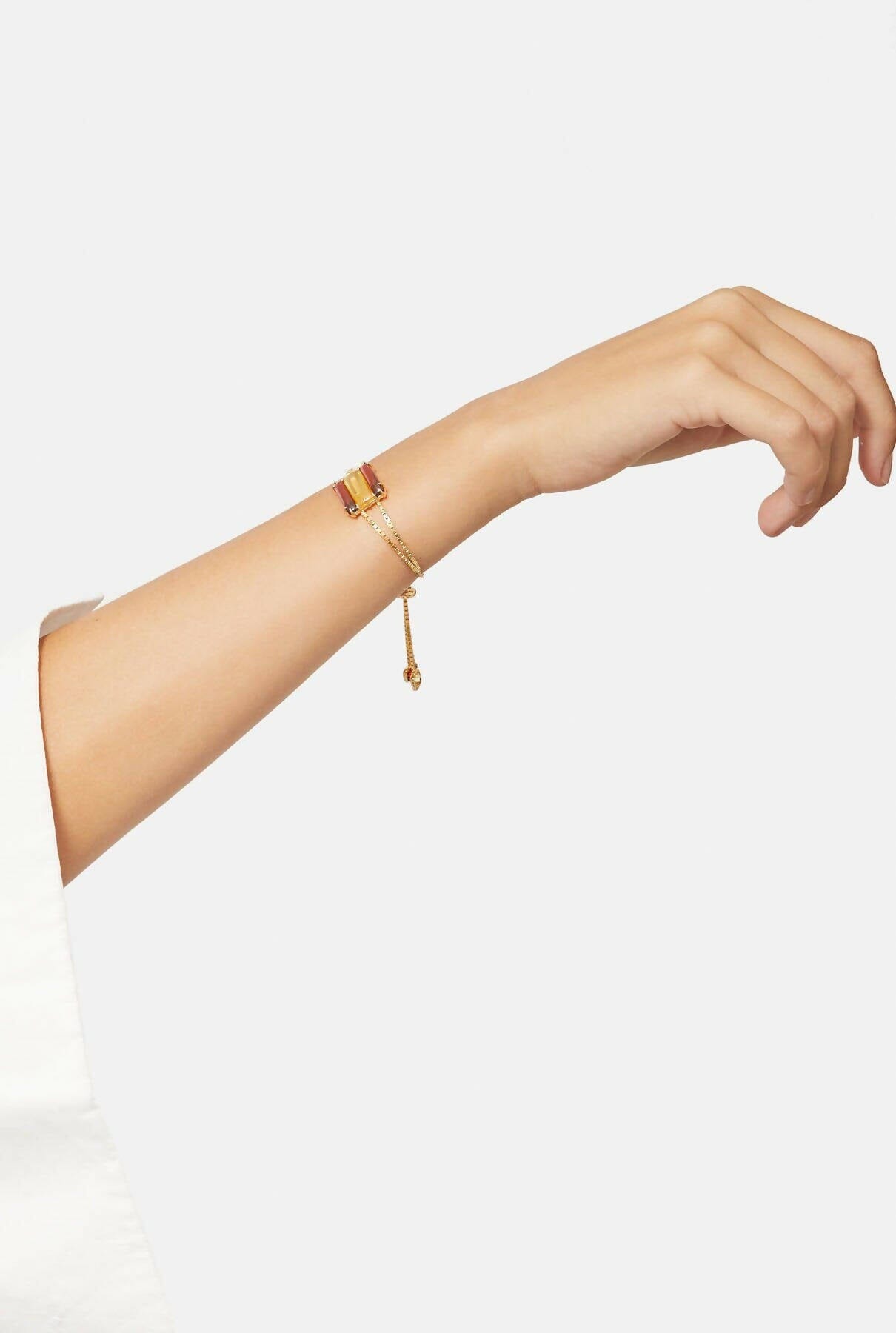 Pulsera España con circonitas rojas y amarillas en tamaño baguette y montadas en una estructura de plata de ley 925 bañada en oro de 18k. Esta pulsera España tiene una cadena con cierre deslizante para ajustarla a cada medida de muñeca. Diseñado por Coolook