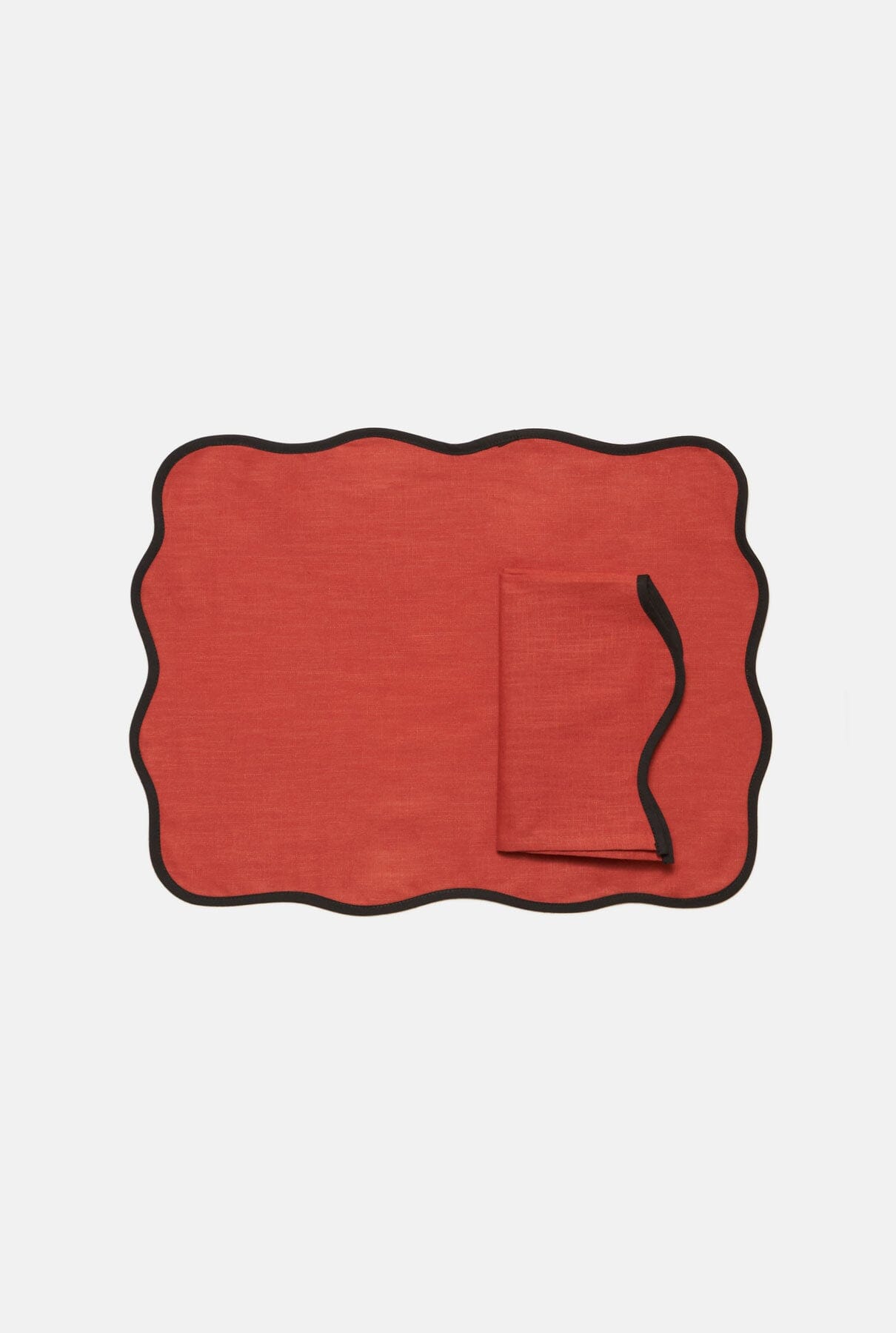 Conjunto para 2 personas incluyendo; 2 manteles individuales de lino naranja con curvas negras + 2 servilletas 45x45 cm de lino negro con curvas blancas.