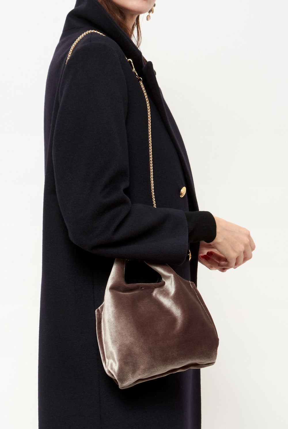 Bolso blando artesanal hecho con Terciopelo. Bolsillo interior y cierre a presión. Cadena dorada desmontable con 2 ganchos. Diseñado por The Bag Lab.
