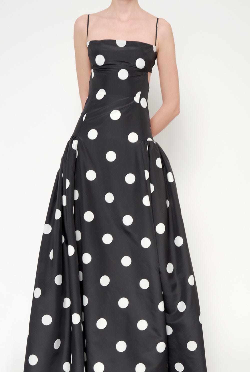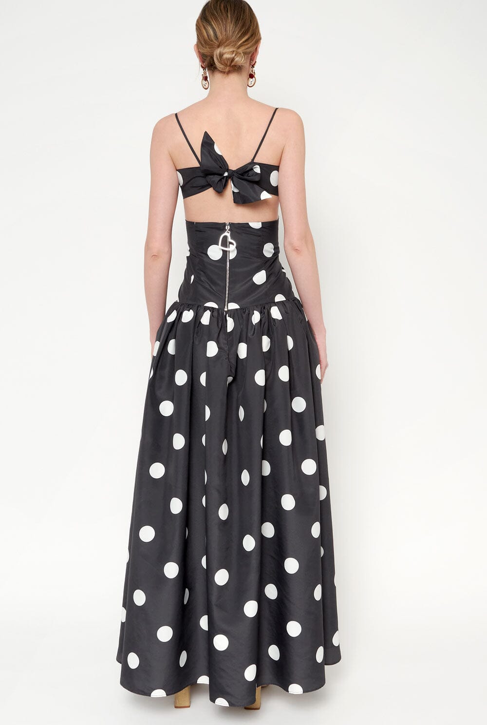 Vestido largo de lunares en tafetán con tirantes cortados, anudado en la espalda con un lazo y falda rizada a la cadera con volante. Diseñado por Juan Vidal.