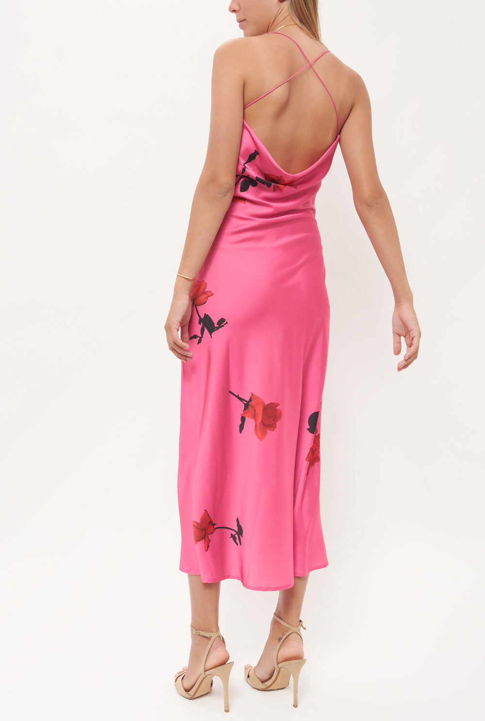 Vestido lencero de tirantes finos, escote drapeado y corte bies, confeccionado en tejido estampado de rosas rojas sobre fondo fucsia. Colección de Juan Vidal en exclusiva para Es Fascinante.