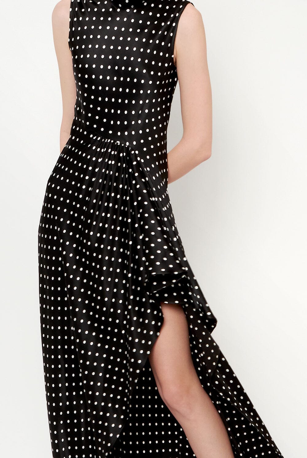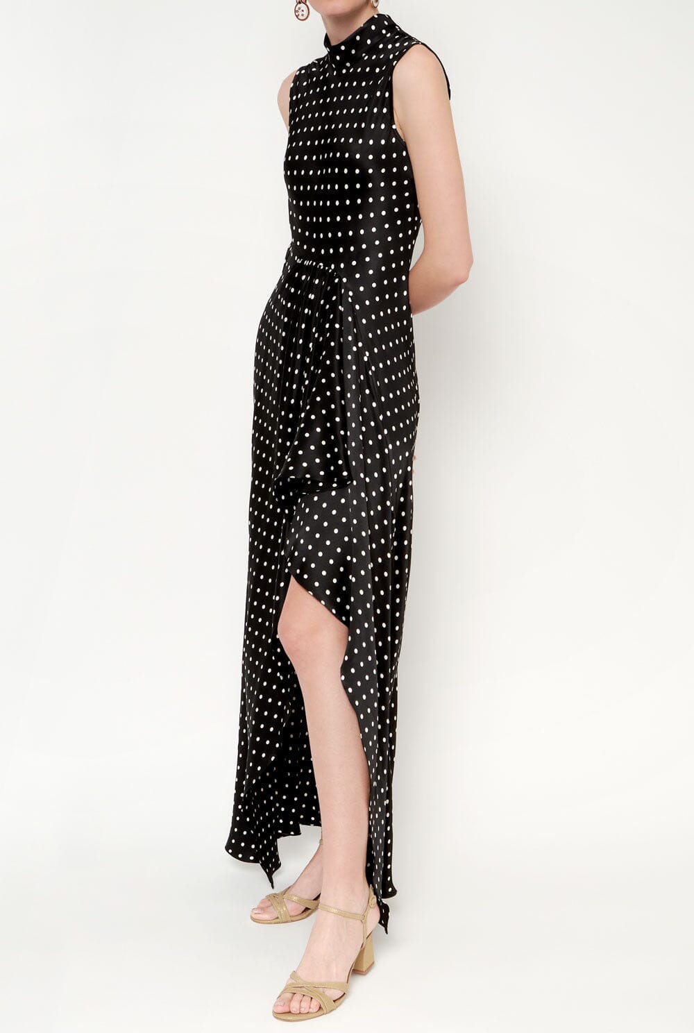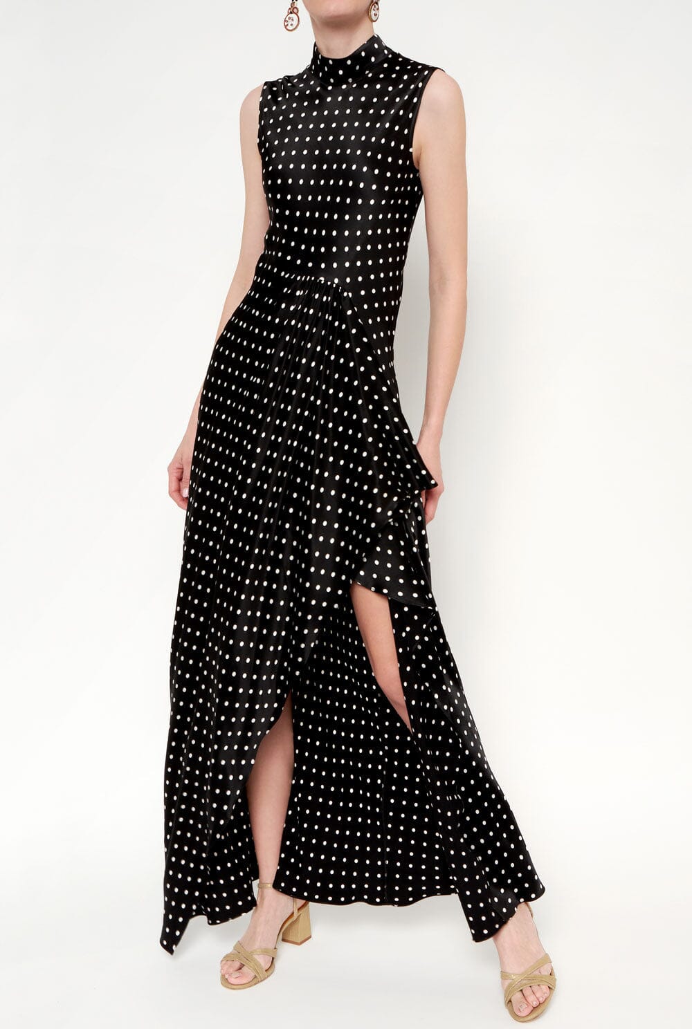 Maxi vestido lencero con escote perkins y abertura en la falda decorada con un volante plano en forma de onda. Diseñado por Juan Vidal.