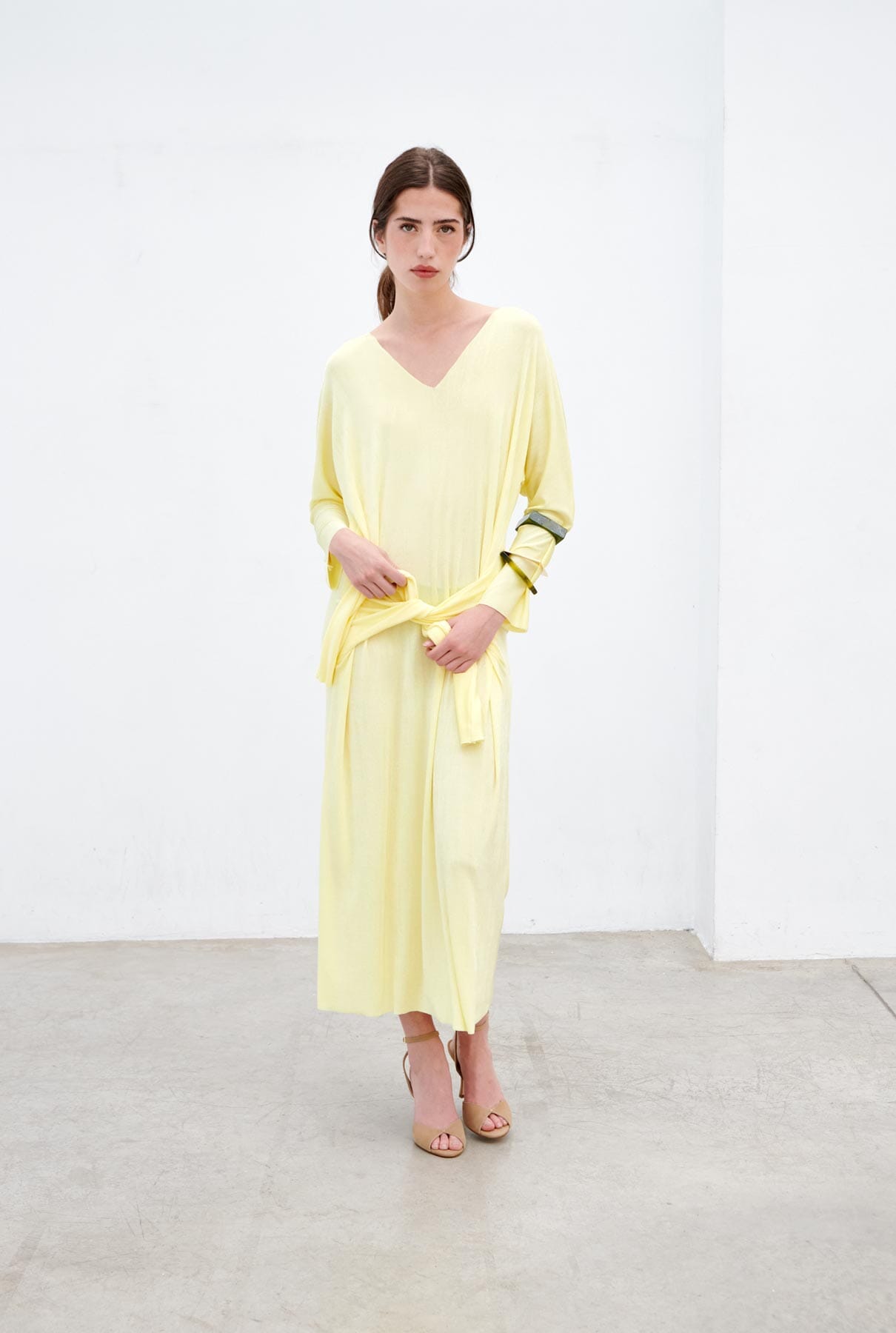 ESCOTE EN V, CORDÓN AJUSTABLE EN LA CADERA, TEÑIDO