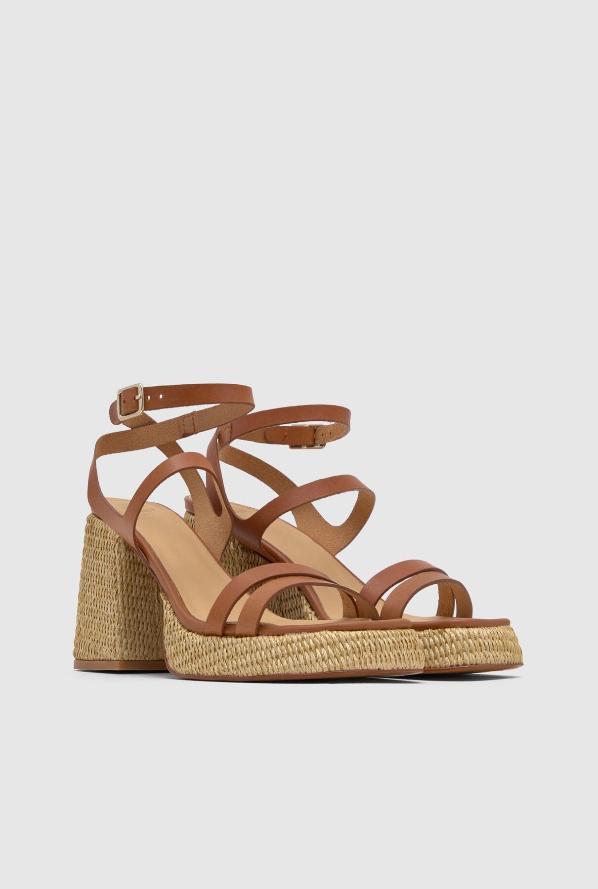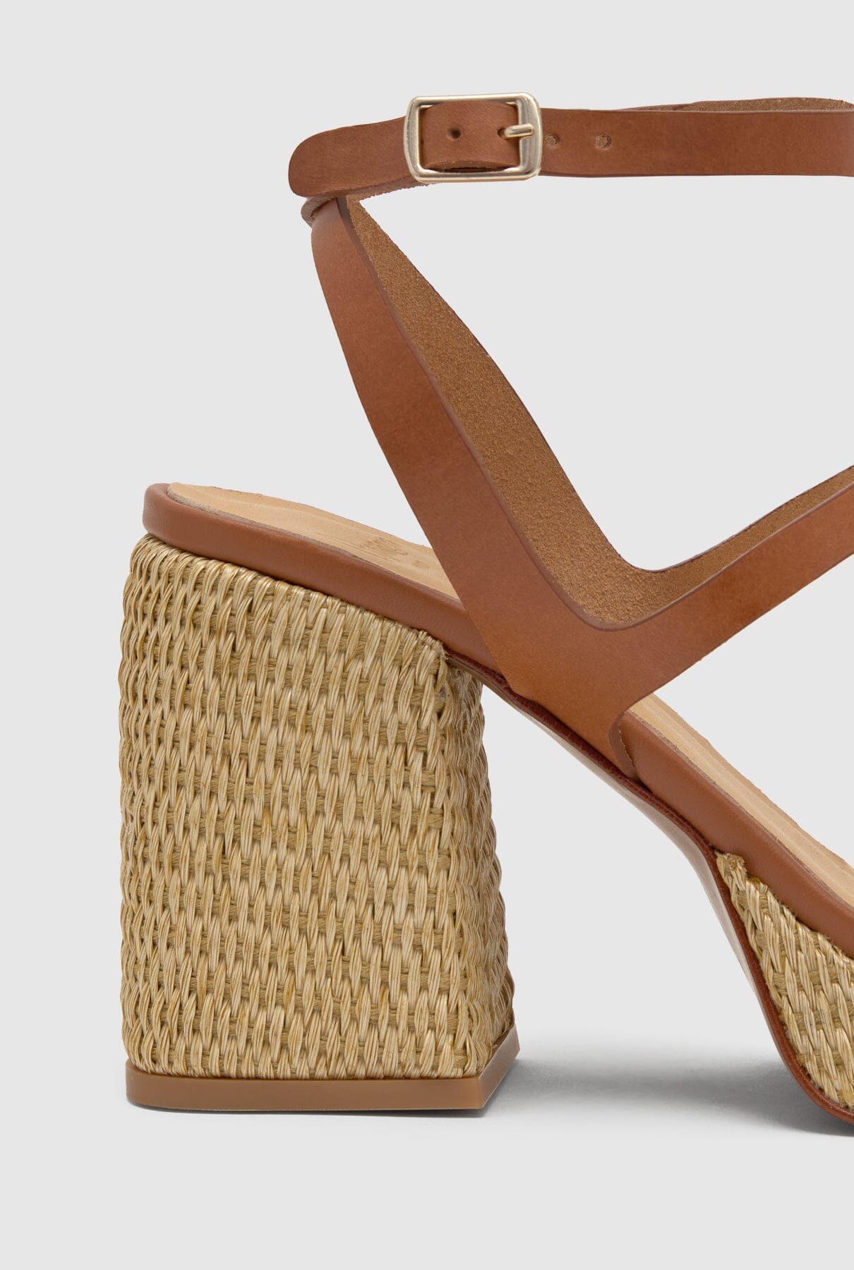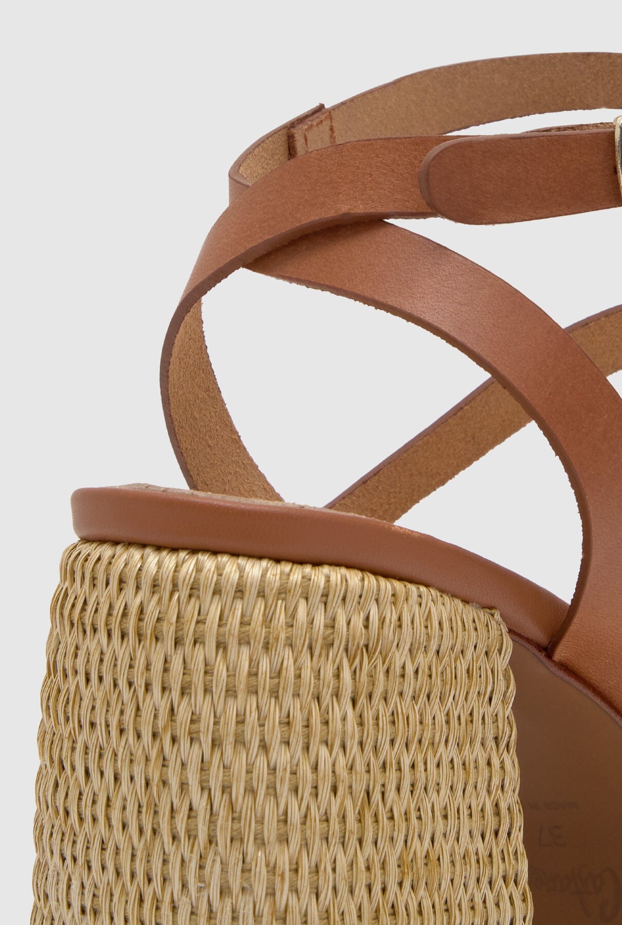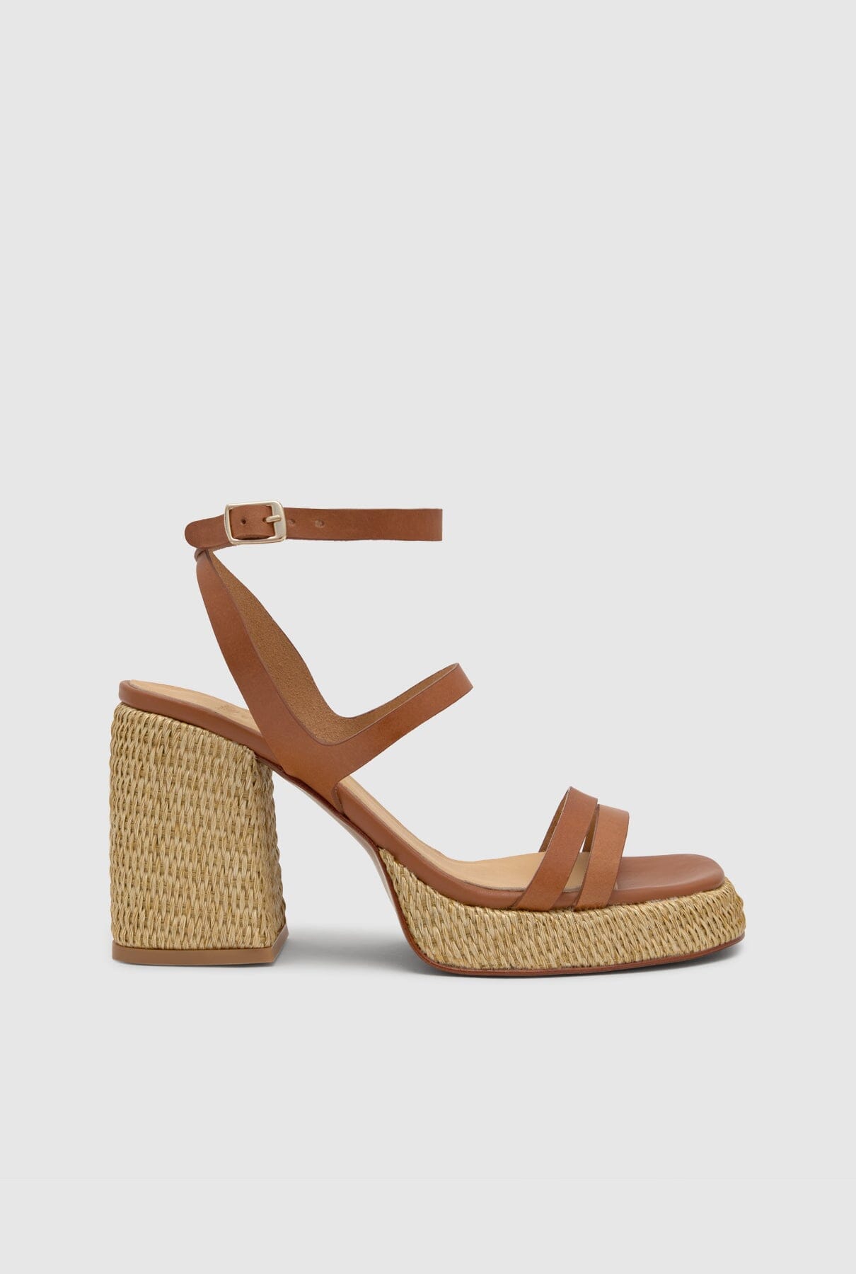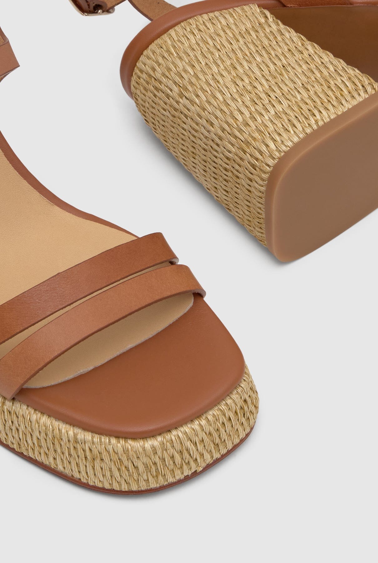 Sandalia Victoria de piel napa con cierre de pulsera, plantilla acolchada y tacón de 10cm forrado de rafia trenzada.