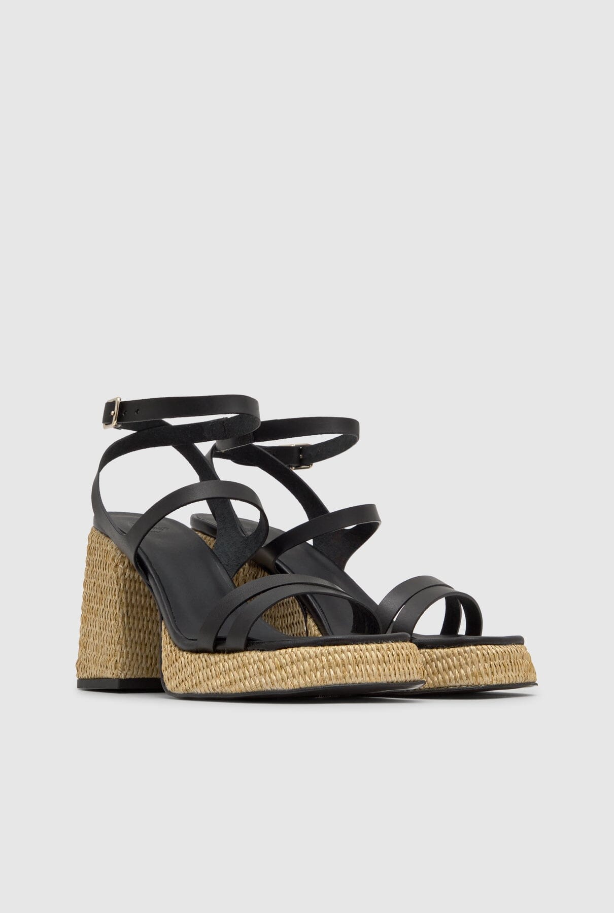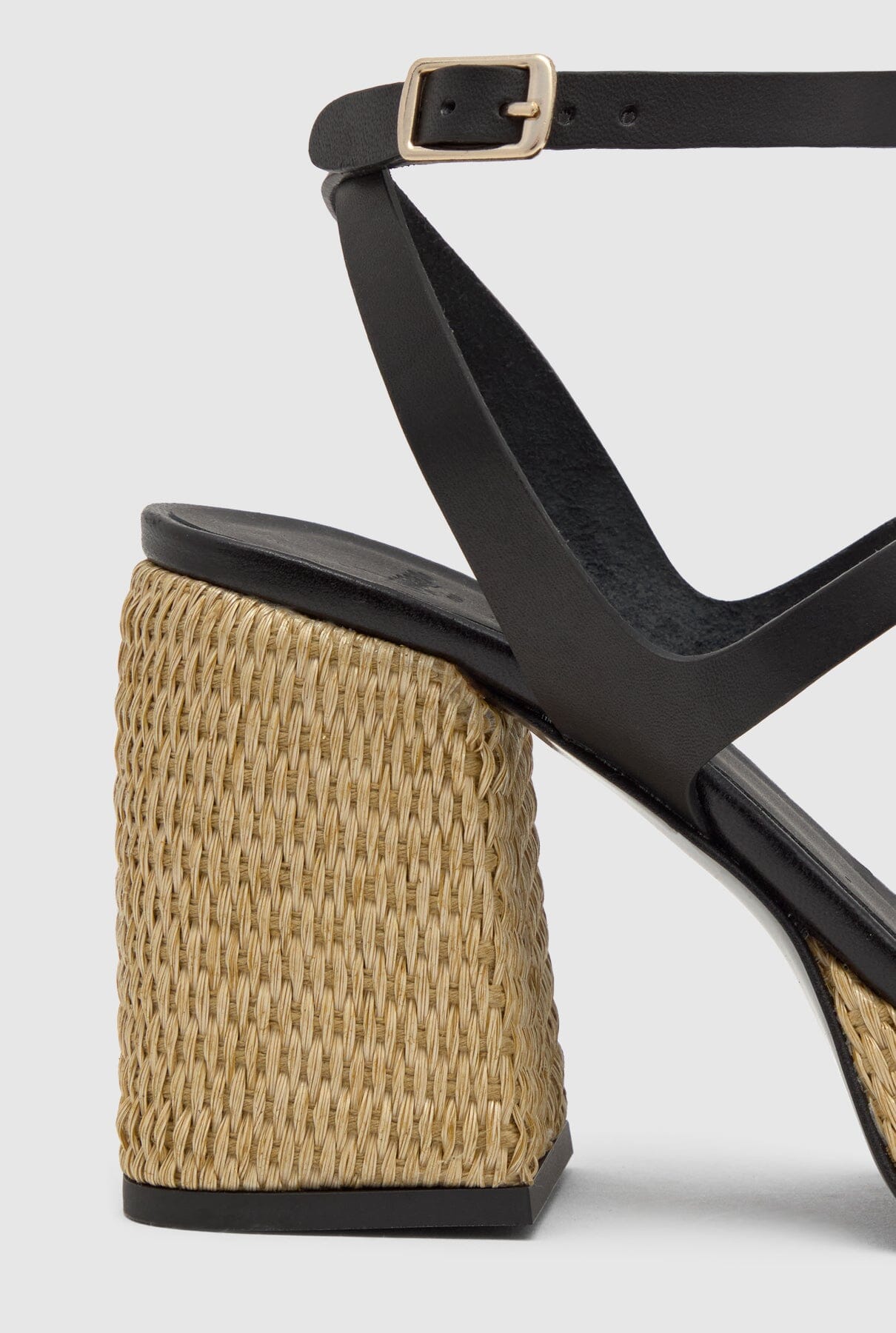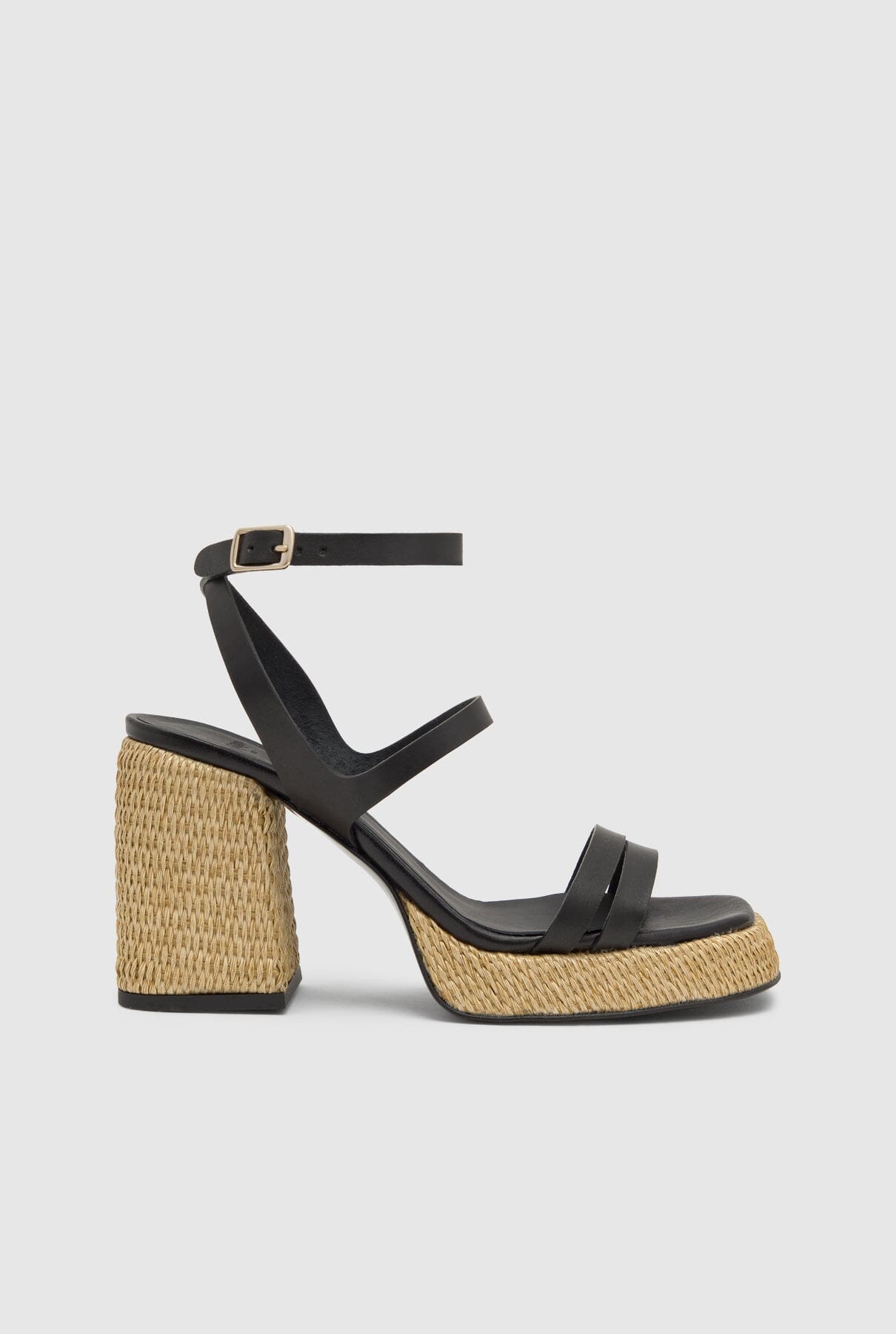 Sandalia Victoria de piel napa con cierre de pulsera, plantilla acolchada y tacón de 10cm forrado de rafia trenzada.
