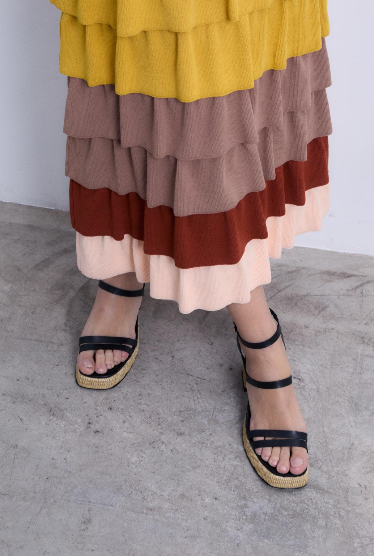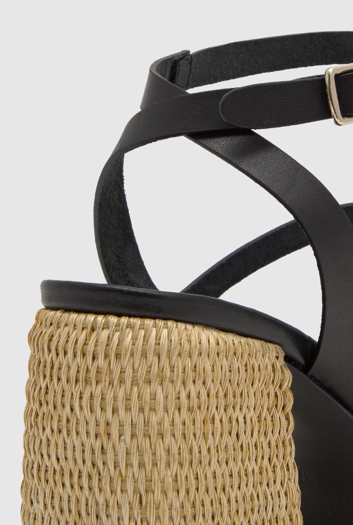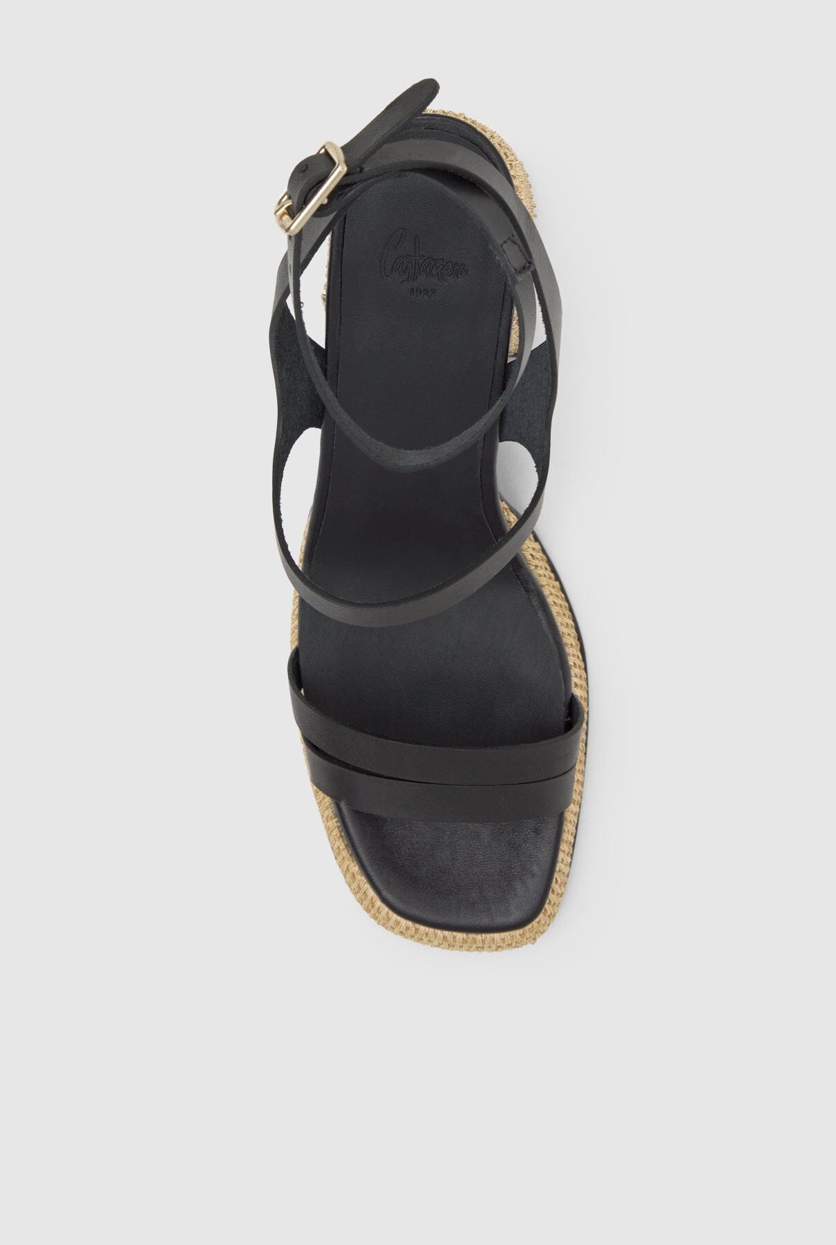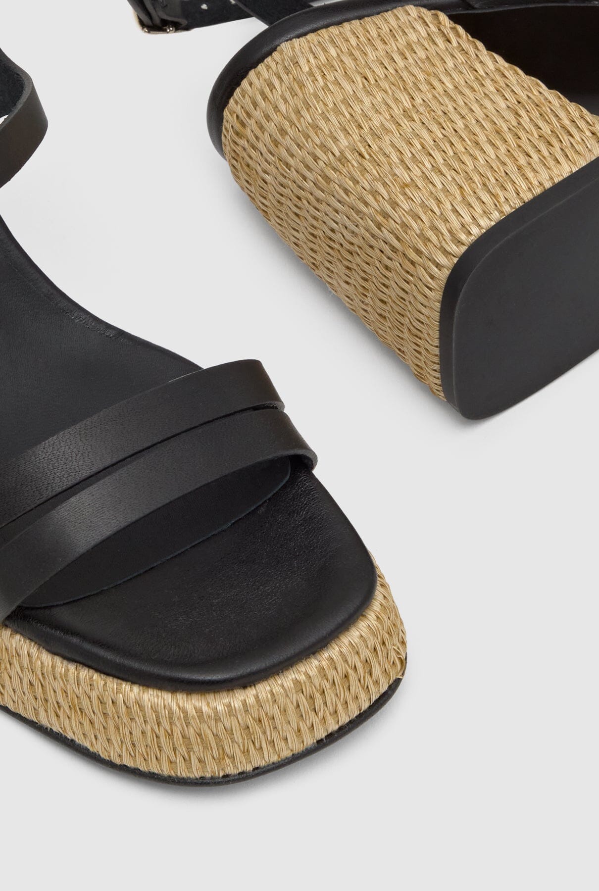 Sandalia Victoria de piel napa con cierre de pulsera, plantilla acolchada y tacón de 10cm forrado de rafia trenzada.